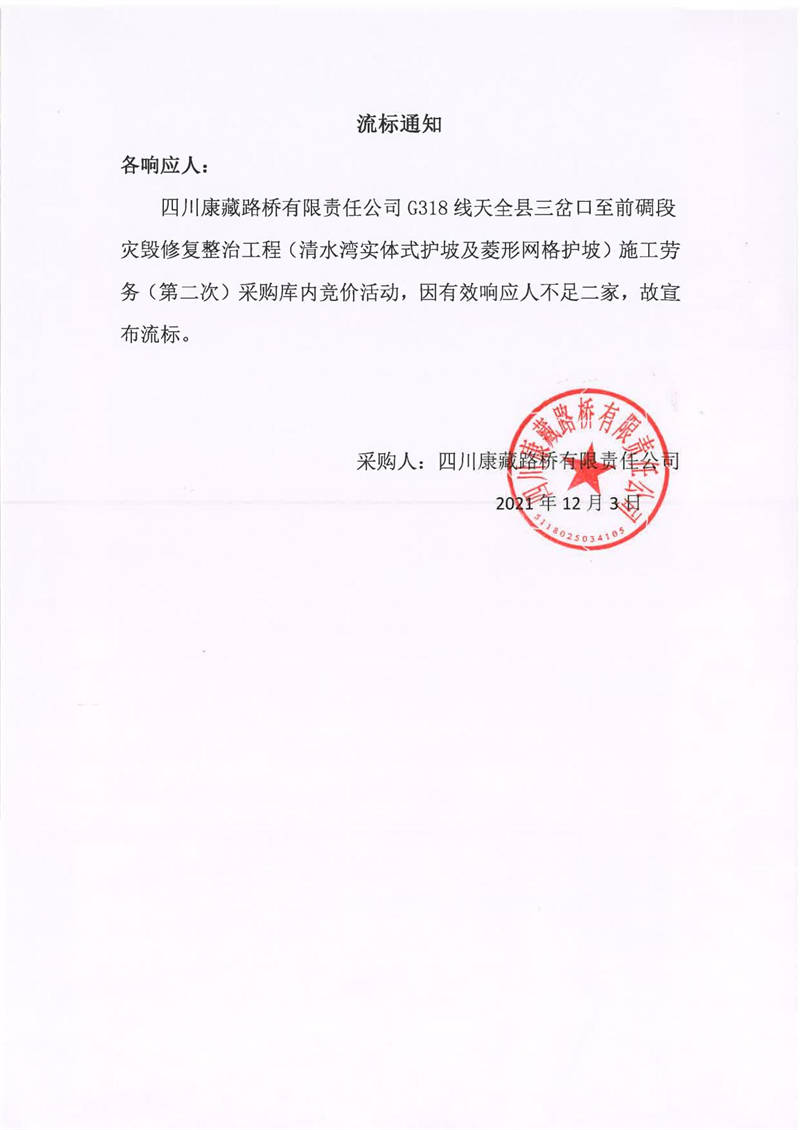 四川康藏路橋有限責(zé)任公司G318線天全縣三岔口至前碉段災(zāi)毀修復(fù)整治工程(清水灣實(shí)體式護(hù)坡及菱形網(wǎng)格護(hù)坡)施工勞務(wù)(第二次)采購流標(biāo)通知