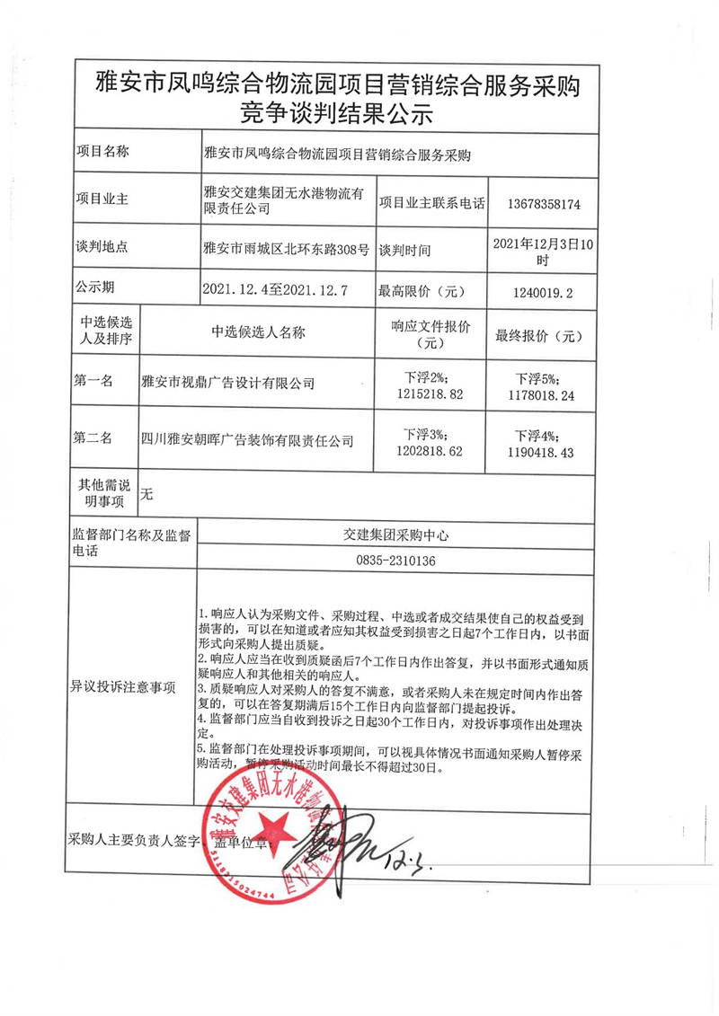 雅安交建集團(tuán)無(wú)水港物流有限責(zé)任公司雅安市鳳鳴綜合物流園項(xiàng)目營(yíng)銷綜合服務(wù)采購(gòu)競(jìng)爭(zhēng)談判結(jié)果公示