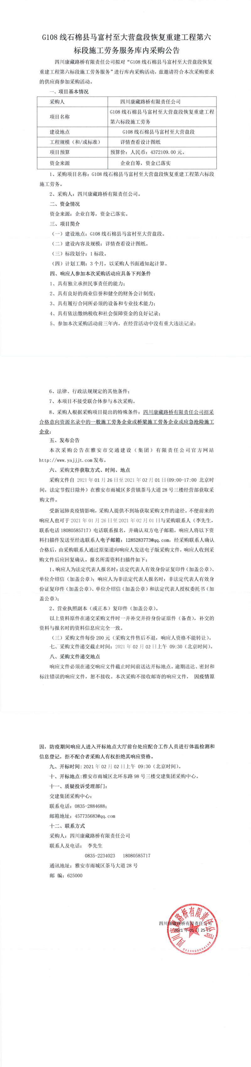 四川康藏路橋有限公司G108線石棉縣馬富村至大營(yíng)盤段恢復(fù)重建工程第六標(biāo)段施工勞務(wù)服務(wù)庫內(nèi)采購(gòu)公告