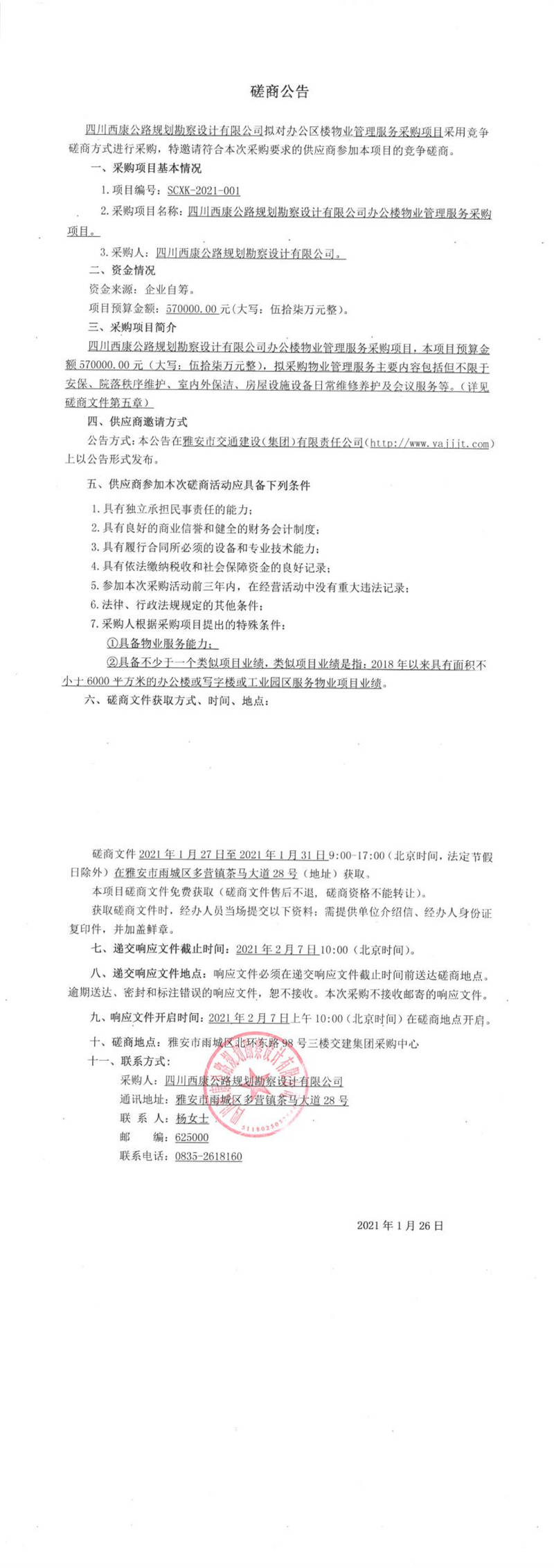 四川西康公路規(guī)劃勘察設計有限公司辦公樓物業(yè)管理服務采購項目競爭磋商公告
