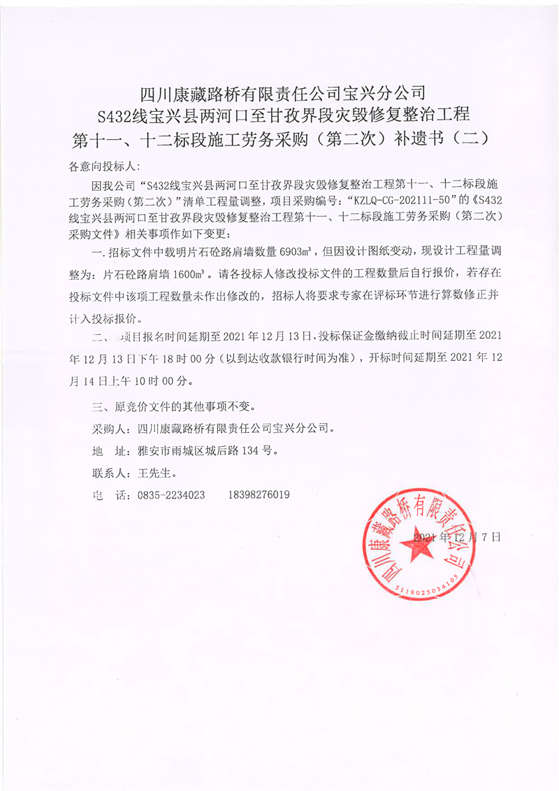 四川康藏路橋有限責任公司寶興分公司S432線寶興縣兩河口至甘孜界段災毀修復整治工程第十一、十二標段施工勞務(wù)采購(第二次)補遺書(二)