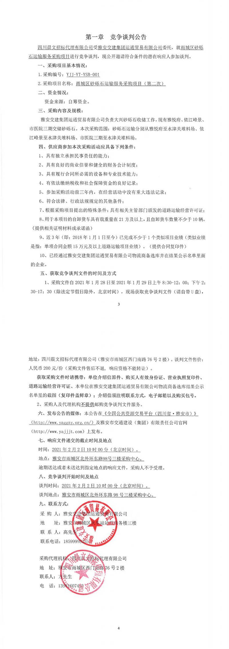 雅安交建集團運通貿(mào)易有限公司雨城區(qū)砂礫石運輸服務(wù)采購項目(第二次)競爭談判公告