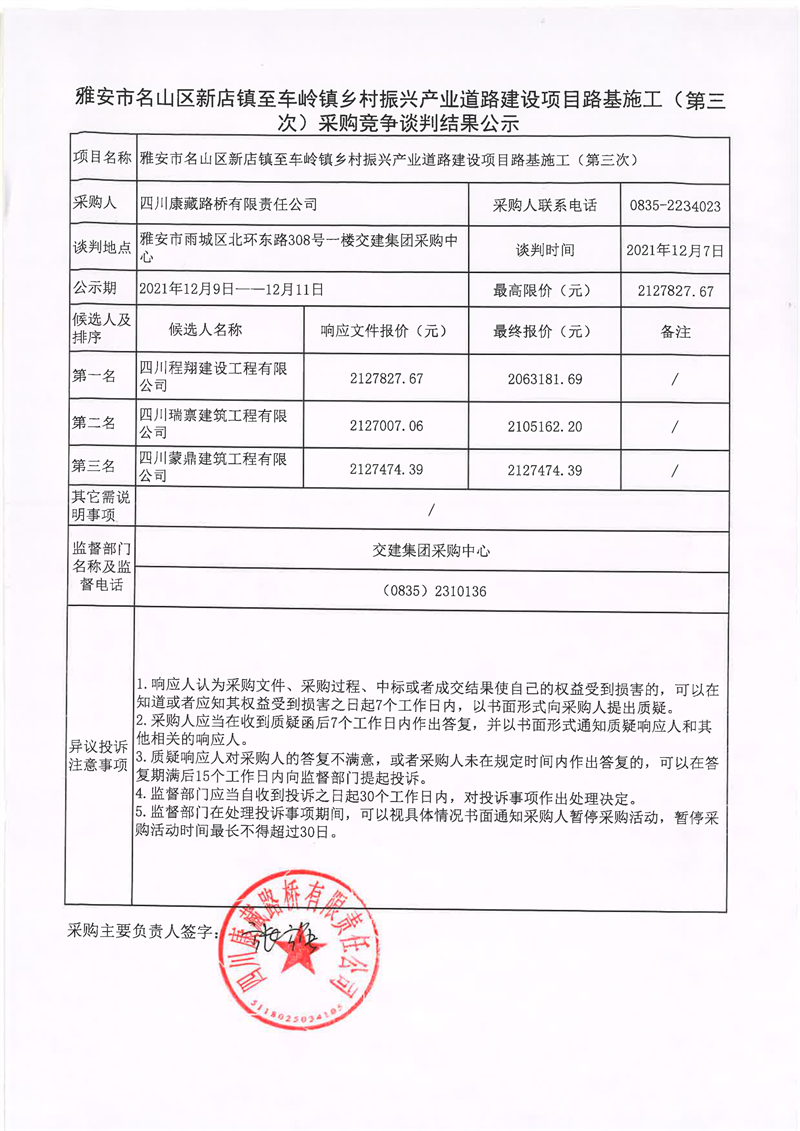 四川康藏路橋有限責任公司雅安市名山區(qū)新店鎮(zhèn)至車嶺鎮(zhèn)鄉(xiāng)村振興產(chǎn)業(yè)道路建設(shè)項目路面施工(第三次)采購競爭談判結(jié)果公示