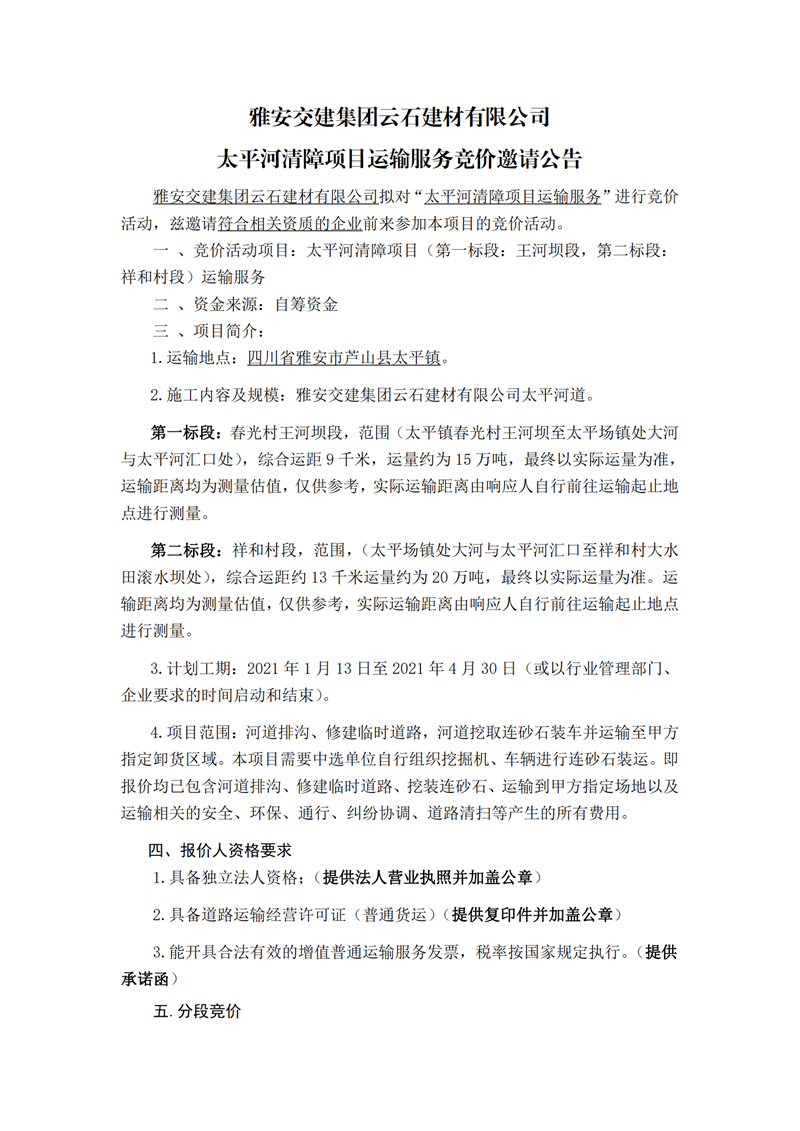 雅安交建集團(tuán)云石建材有限公司太平河清障項(xiàng)目運(yùn)輸服務(wù)競(jìng)價(jià)邀請(qǐng)公告