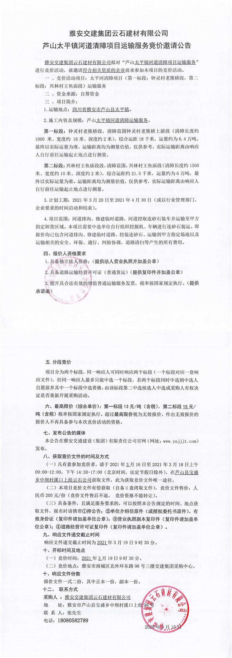 雅安交建集團云石建材有限公司蘆山太平鎮(zhèn)河道清障項目運輸服務(wù)競價邀請公告