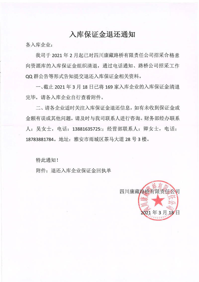 四川康藏路橋有限責(zé)任公司入庫保證金退還通知