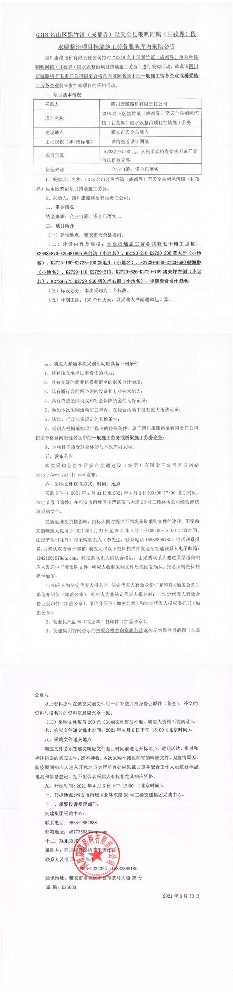 四川康藏路橋有限責任公司G318名山區(qū)黑竹鎮(zhèn)(成都界)至天全縣喇叭河鎮(zhèn)(甘孜界)段水毀整治項目擋墻施工勞務服務庫內采購公告