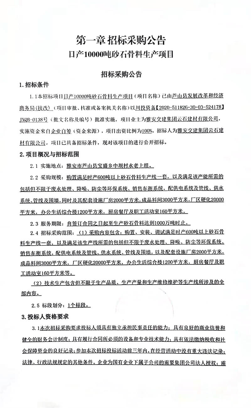 雅安交建集團云石建材有限公司日產(chǎn)10000噸砂石骨料生產(chǎn)項目招標采購公告
