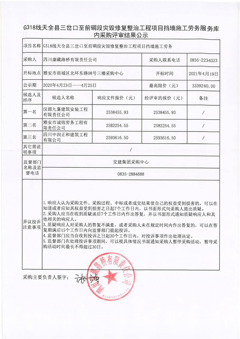 四川康藏路橋有限責(zé)任公司G318線(xiàn)天全縣三岔口至前碉段災(zāi)毀修復(fù)整治工程項(xiàng)目擋墻施工勞務(wù)服務(wù)庫(kù)內(nèi)采購(gòu)評(píng)審結(jié)果公示