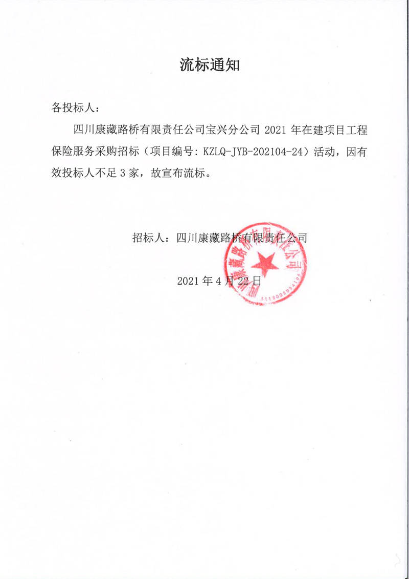 四川康藏路橋有限責(zé)任公司寶興分公司2021年在建項目工程保險服務(wù)采購流標(biāo)通知