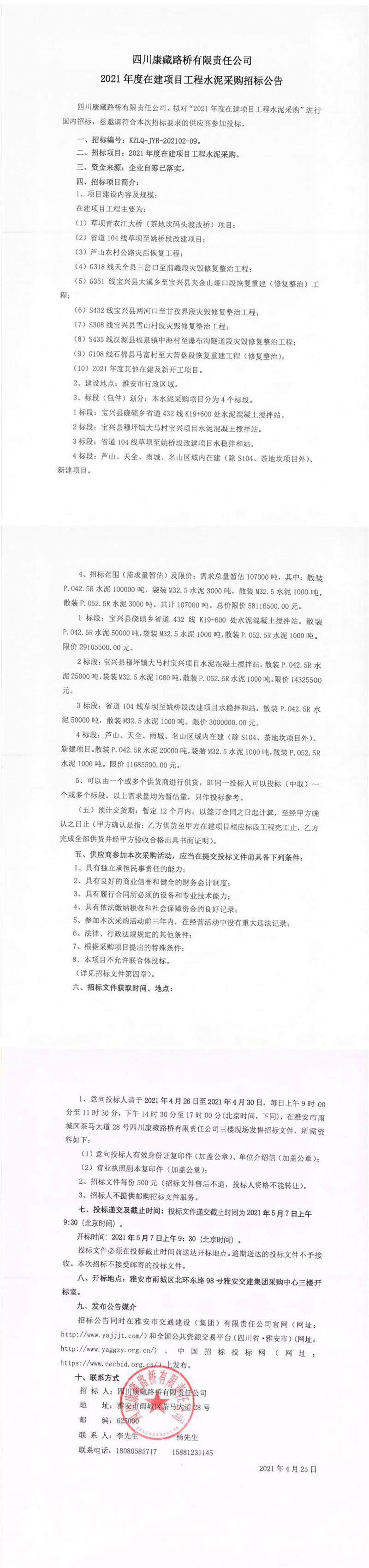 四川康藏路橋有限責(zé)任公司2021年度在建項(xiàng)目工程水泥采購(gòu)招標(biāo)公告