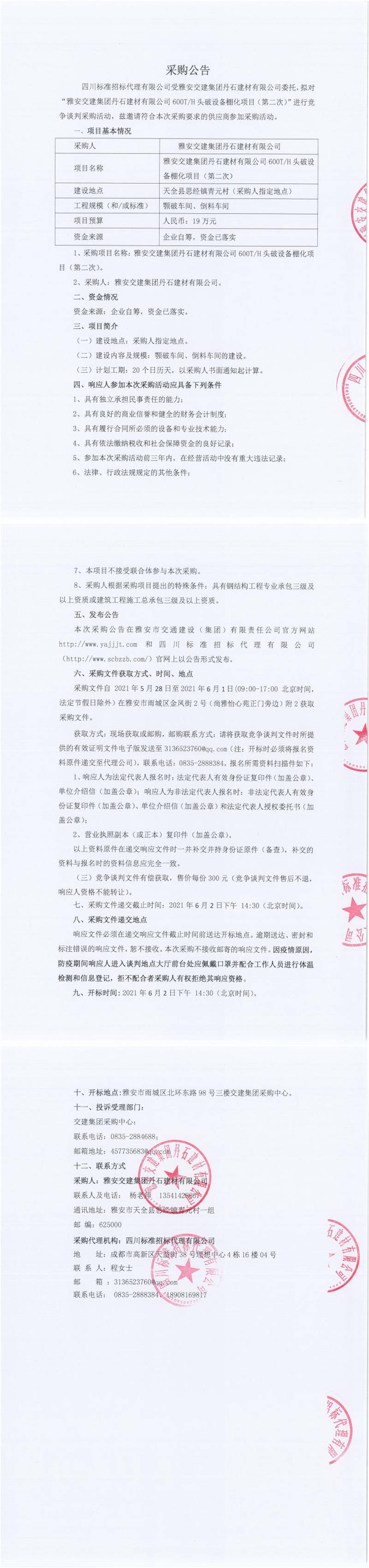 雅安交建集團(tuán)丹石建材有限公司600T/H頭破設(shè)備棚化項目(第二次)競爭談判公告