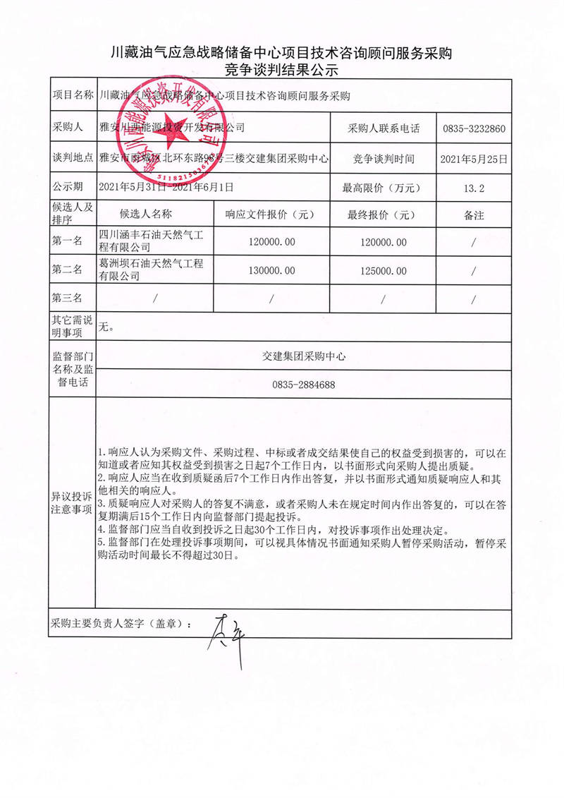 雅安川西能源投資開發(fā)有限公司川藏油氣應(yīng)急戰(zhàn)略儲備中心項(xiàng)目技術(shù)咨詢顧問服務(wù)采購競爭談判結(jié)果公示