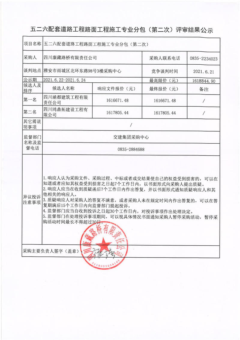 四川康藏路橋有限責(zé)任公司五二六配套道路工程路面工程施工專業(yè)分包(第二次)評(píng)審結(jié)果公示