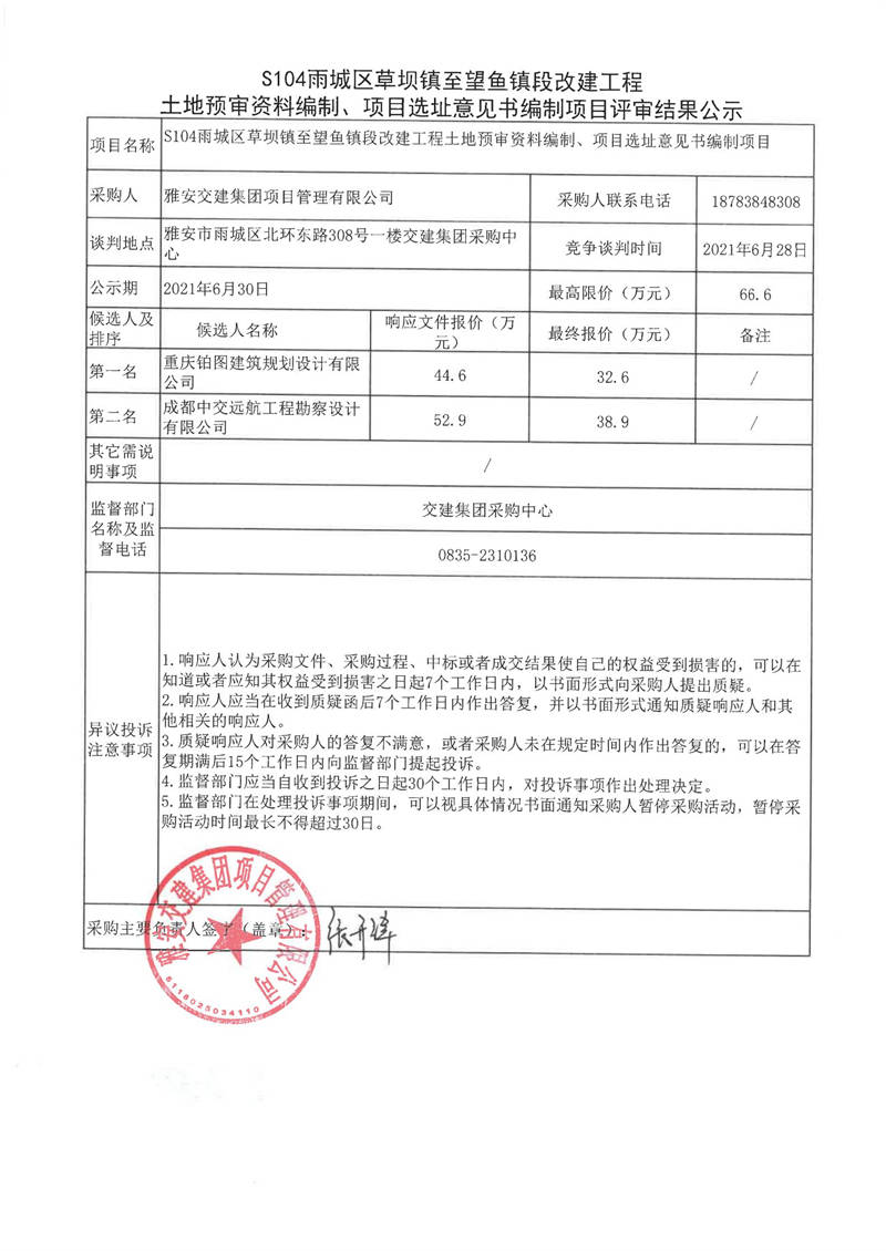 雅安交建集團項目管理有限公司S104雨城區(qū)草壩鎮(zhèn)至望魚鎮(zhèn)段改建工程土地預審資料編制、項目選址意見書編制項目評審結(jié)果公示