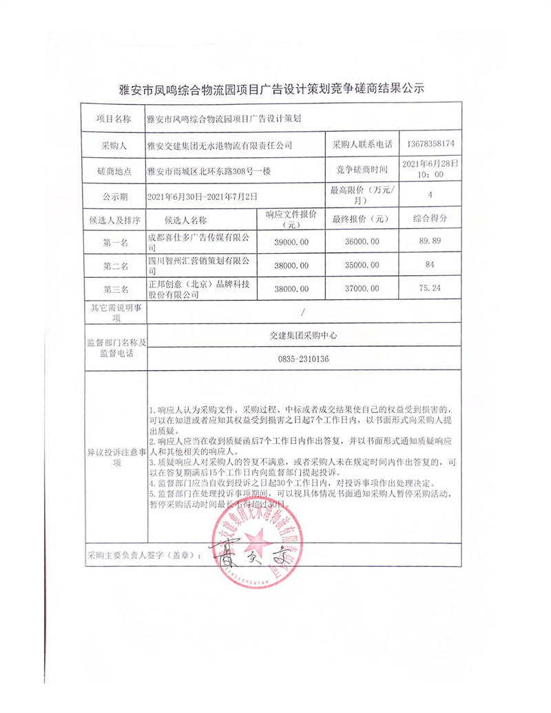 雅安交建集團(tuán)無(wú)水港物流有限責(zé)任公司雅安市鳳鳴綜合物流園項(xiàng)目廣告設(shè)計(jì)策劃競(jìng)爭(zhēng)磋商結(jié)果公示