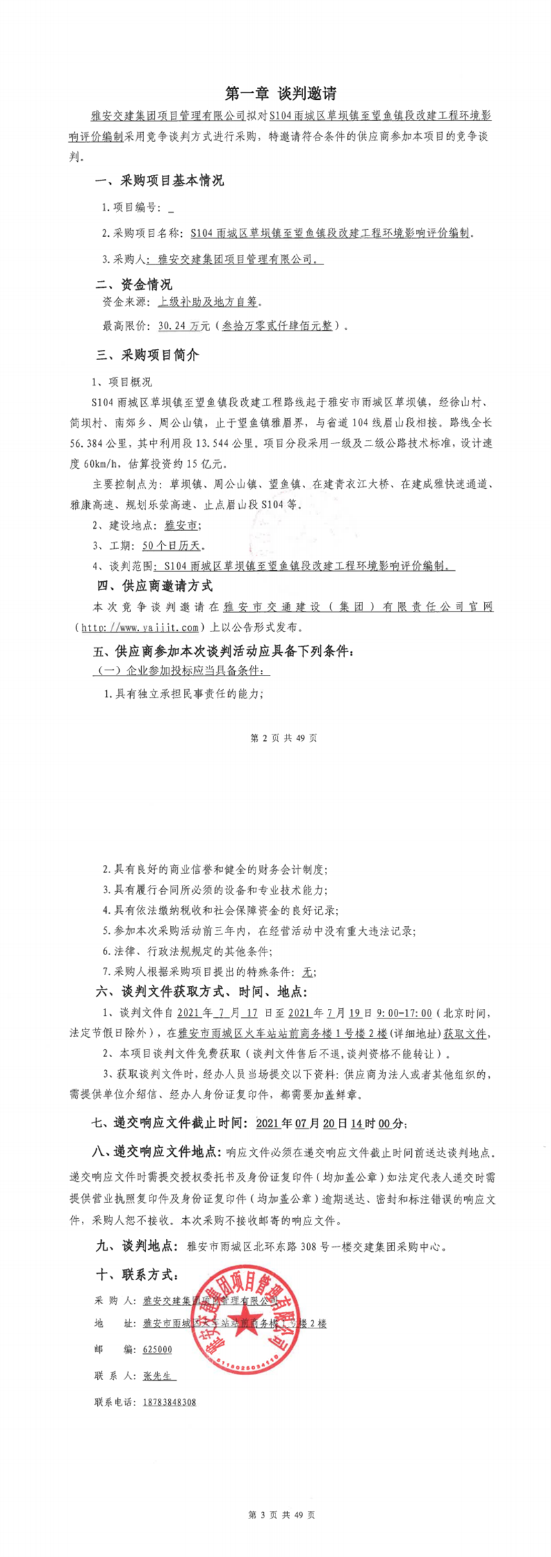 雅安交建集團項目管理有限公司S104雨城區(qū)草壩鎮(zhèn)至望魚段改建工程環(huán)境影響評價編制競爭談判公告