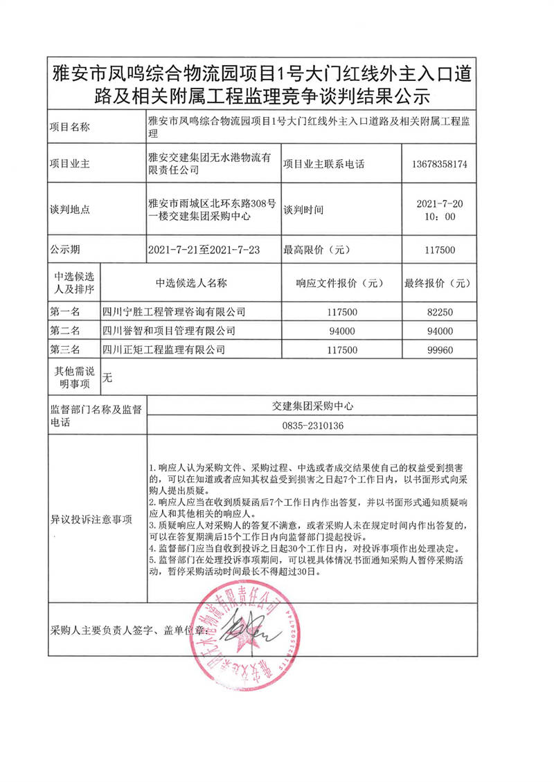 雅安交建集團(tuán)無(wú)水港物流有限責(zé)任公司雅安市鳳鳴綜合物流園項(xiàng)目1號(hào)大門紅線外主入口道路及相關(guān)附屬工程監(jiān)理競(jìng)爭(zhēng)談判結(jié)果公示
