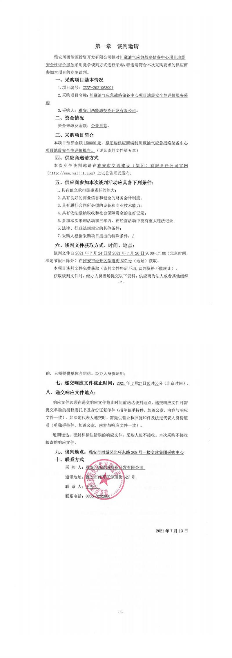 雅安川西能源投資開發(fā)有限公司川藏油氣應急戰(zhàn)略儲備中心項目地震安全性評價服務采購競爭談判公告