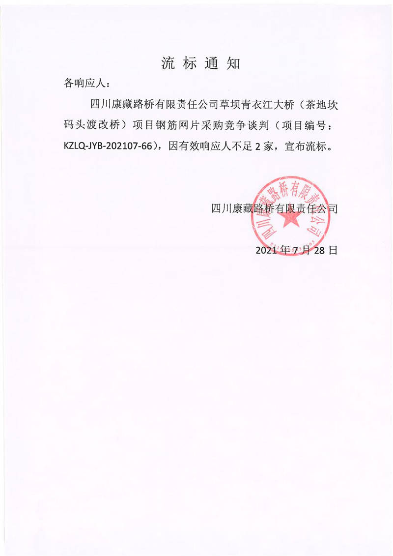 四川康藏路橋有限責(zé)任公司草壩青衣江大橋(茶地坎碼頭渡改橋)項目鋼筋網(wǎng)片采購競爭談判流標通知