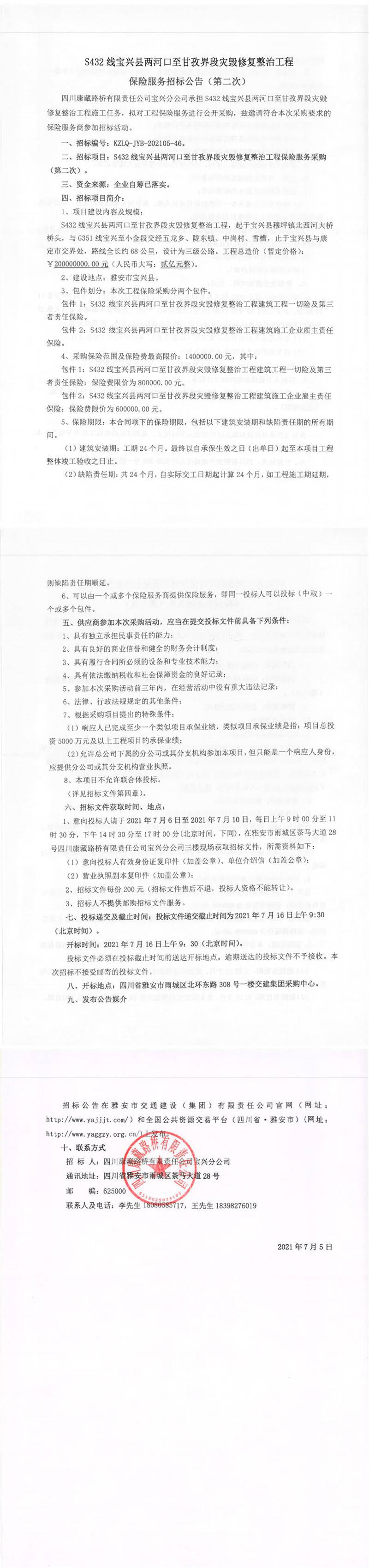 四川康藏路橋有限責任公司S432線寶興縣兩河口至甘孜界段災毀修復整治工程保險服務(wù)招標公告(第二次)
