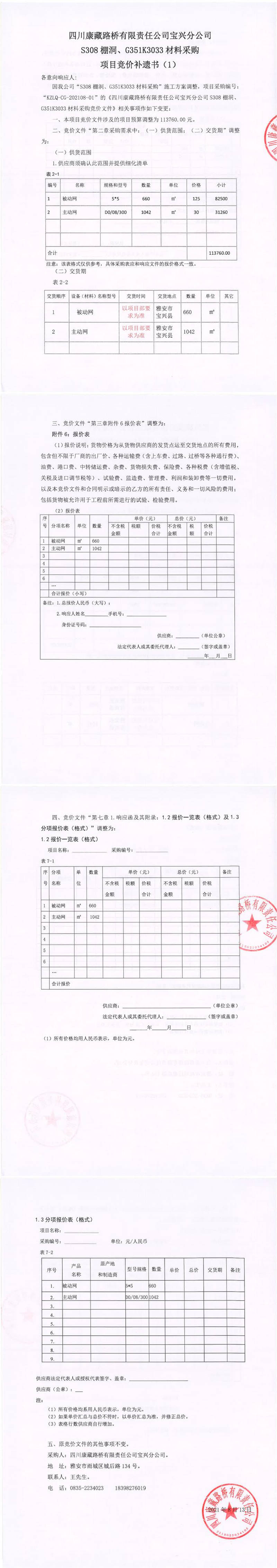 四川康藏路橋有限責(zé)任公司寶興分公司S308棚洞、G351K3033材料采購項(xiàng)目競價(jià)補(bǔ)遺書(1)