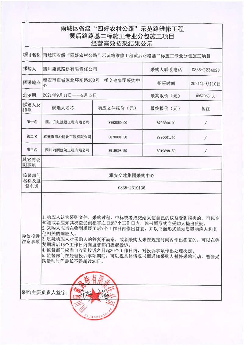 四川康藏路橋有限責(zé)任公司雨城區(qū)省級“四好農(nóng)村公路”示范路維修工程黃后路路基二標施工專業(yè)分包施工項目經(jīng)營高效招采結(jié)果公示