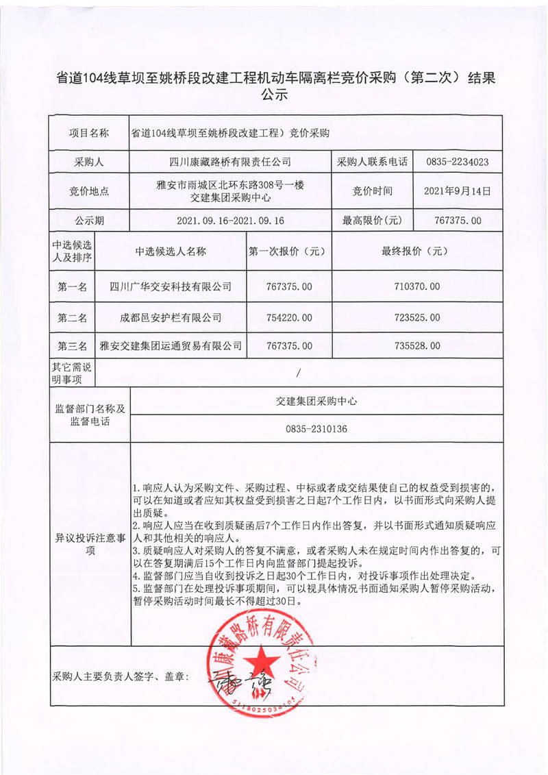 四川康藏路橋有限責(zé)任公司省道104線草壩至姚橋段改建工程機(jī)動(dòng)車隔離欄競(jìng)價(jià)采購(gòu)(第二次)結(jié)果公示