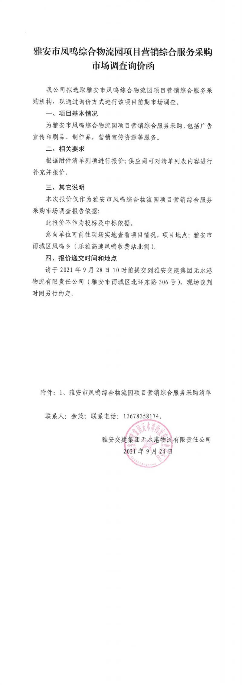 雅安交建集團(tuán)無水港物流有限責(zé)任公司雅安市鳳鳴綜合物流園項目營銷綜合服務(wù)采購市場調(diào)查詢價函