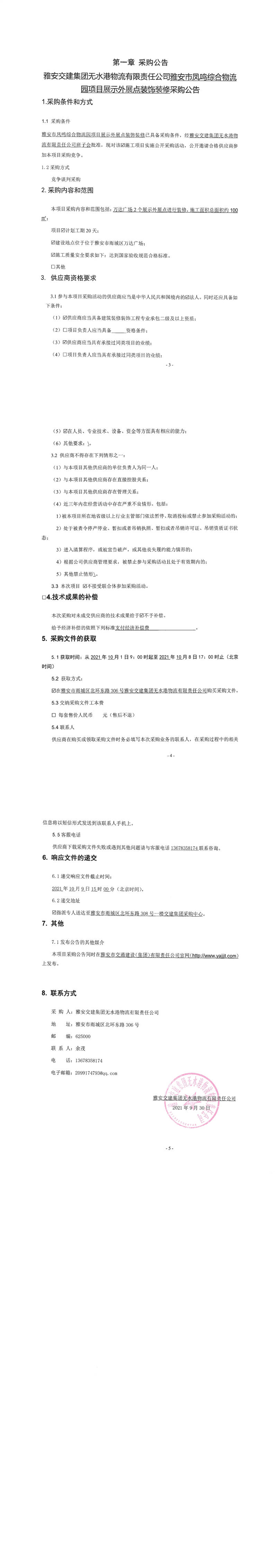 雅安交建集團(tuán)無水港物流有限責(zé)任公司雅安市鳳鳴綜合物流園項(xiàng)目展示外展點(diǎn)裝飾裝修采購公告
