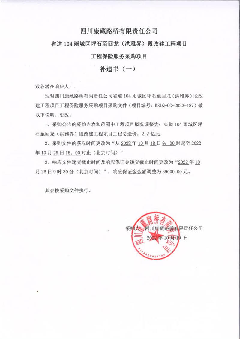 四川康藏路橋有限責(zé)任公司省道104雨城區(qū)坪石至回龍(洪雅界)段改建工程項(xiàng)目工程保險(xiǎn)服務(wù)采購項(xiàng)目補(bǔ)遺書(一)