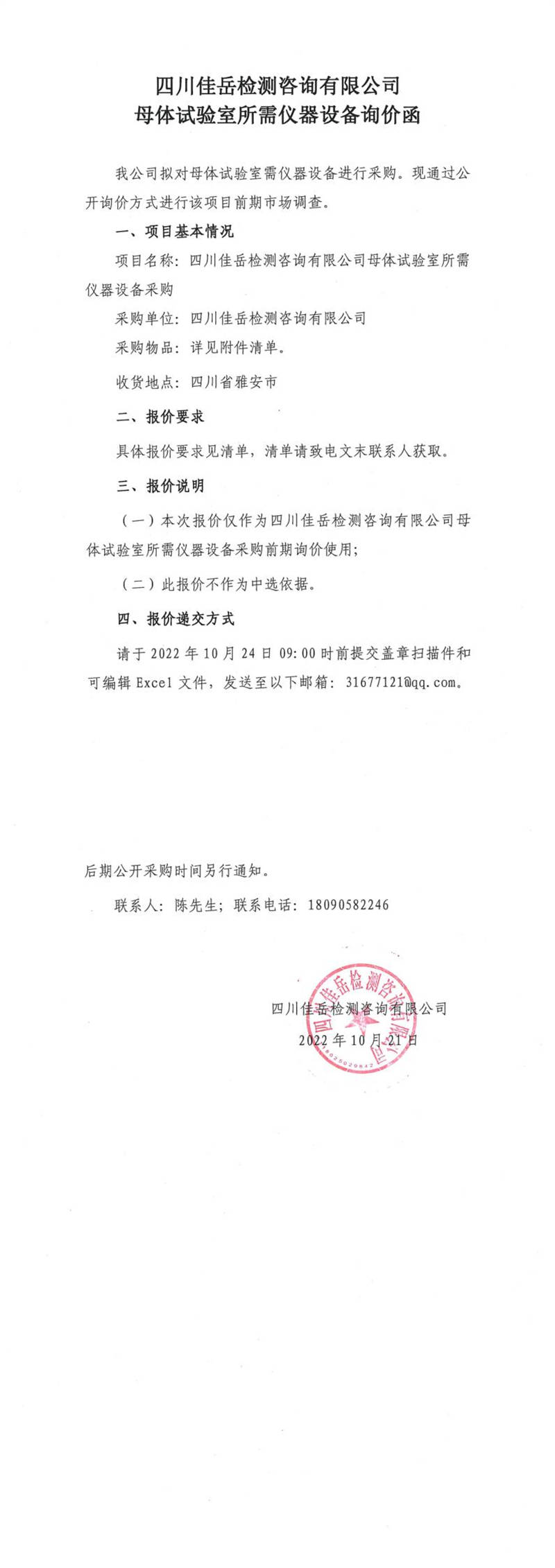 四川佳岳檢測咨詢有限公司母體試驗室所需儀器設備詢價函