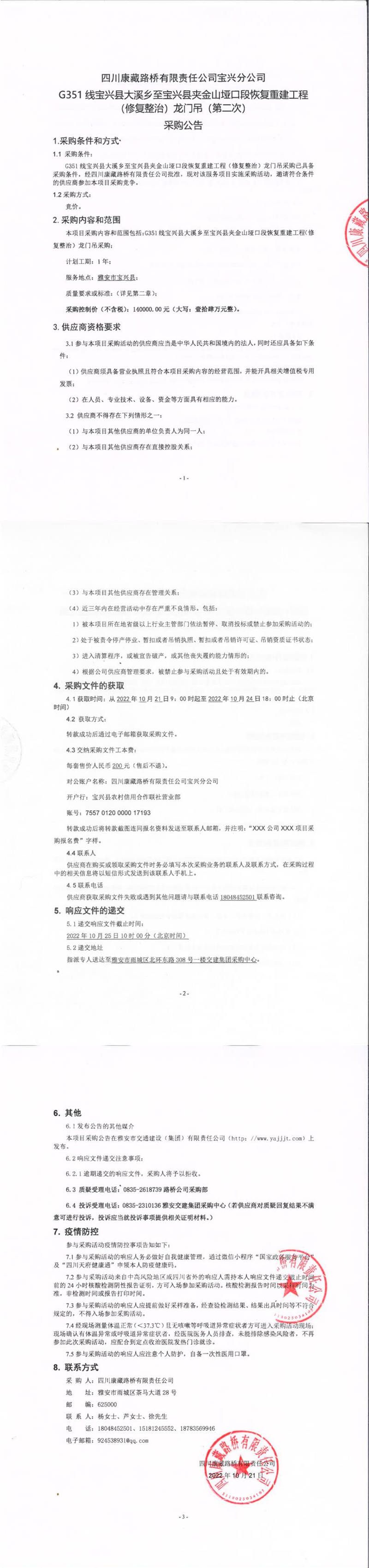 四川康藏路橋有限責(zé)任公司寶興分公司G351線(xiàn)寶興縣大溪鄉(xiāng)至寶興縣夾金山埡口段恢復(fù)重建工程(修復(fù)整治)龍門(mén)吊(第二次)采購(gòu)公告