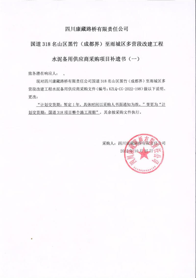 四川康藏路橋有限責(zé)任公司國道318名山區(qū)黑竹(成都界)至雨城區(qū)多營段改建工程水泥備用供應(yīng)商采購項目補遺書(一)