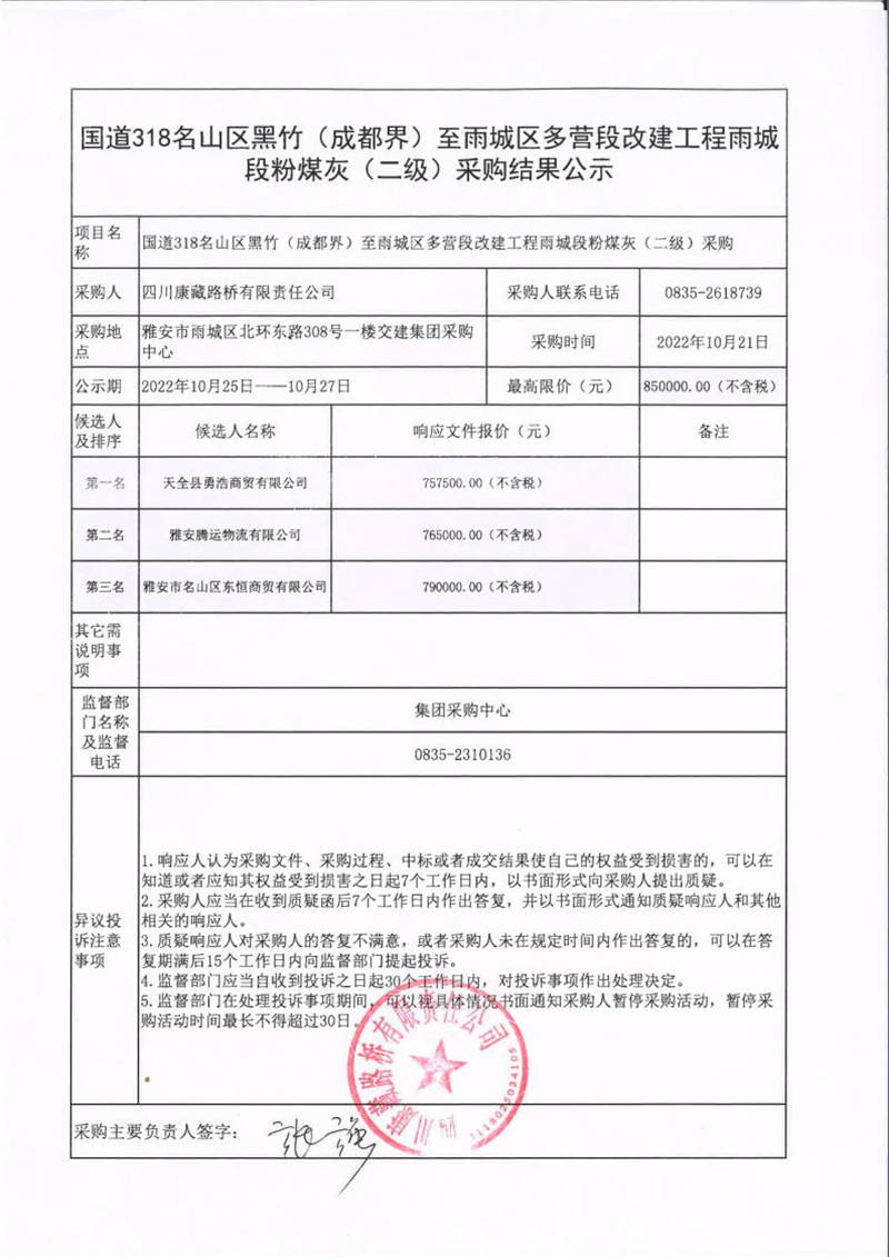 四川康藏路橋有限責(zé)任公司國道318名山區(qū)黑竹(成都界)至雨城區(qū)多營段改建工程雨城段粉煤灰(二級)采購結(jié)果公示
