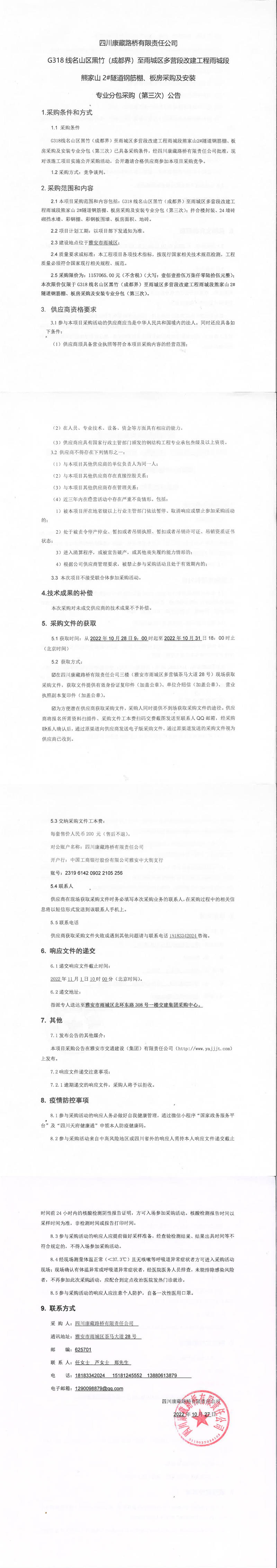 四川康藏路橋有限責(zé)任公司G318線名山區(qū)黑竹(成都界)至雨城區(qū)多營段改建工程雨城段熊家山2#隧道鋼筋棚、板房采購及安裝專業(yè)分包采購(第三次)公告