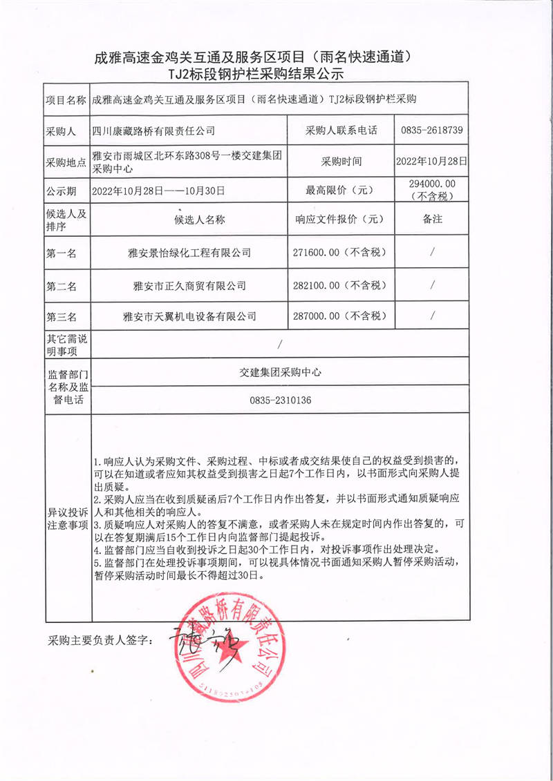 四川康藏路橋有限責任公司成都高速金雞關(guān)互通及服務區(qū)項目(雨名快速通道)TJ2標段鋼護欄采購結(jié)果公示