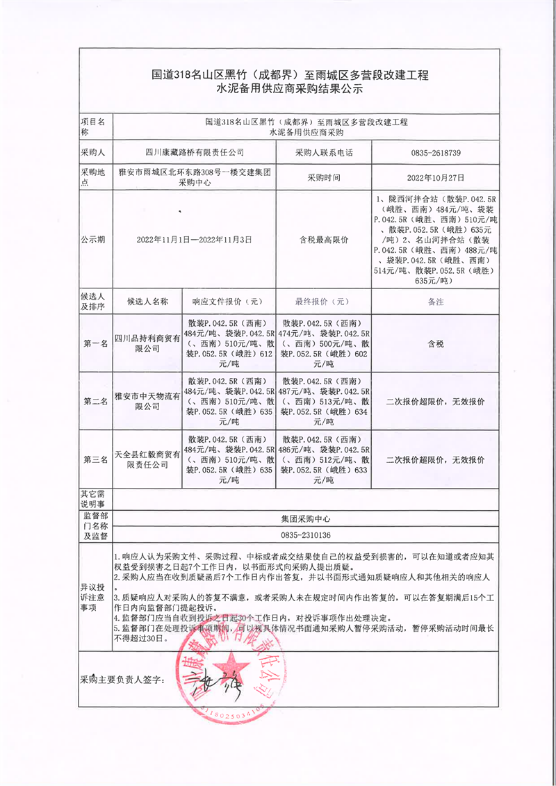 四川康藏路橋有限責(zé)任公司國道318名山區(qū)黑竹(成都界)至雨城區(qū)多營段改建工程水泥備用供應(yīng)商采購結(jié)果公示