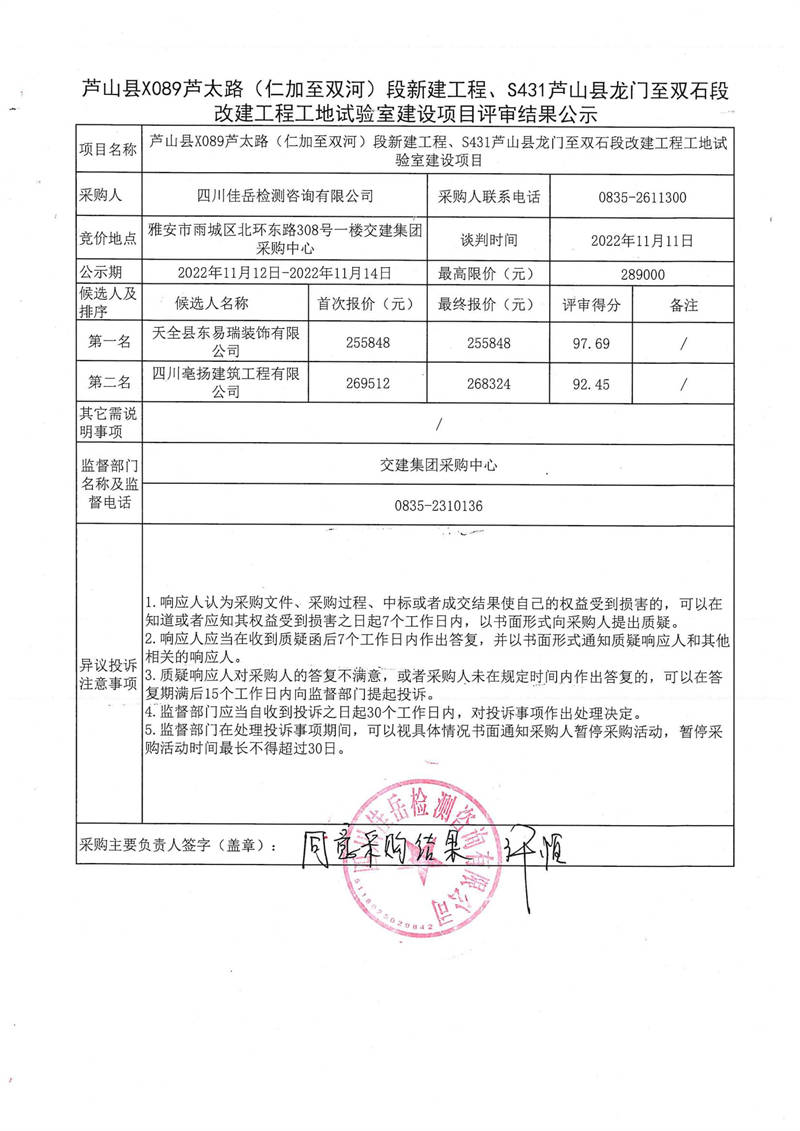 四川佳岳檢測咨詢有限公司蘆山縣X089蘆太路(仁加至雙河)段新建工程、S431蘆山縣龍門至雙石段改建工程工地試驗室建設(shè)項目評審結(jié)果公示