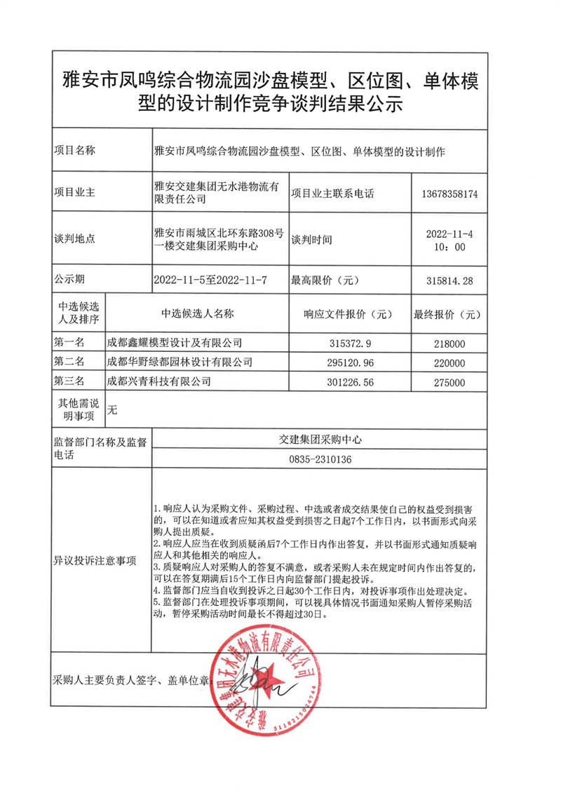 雅安交建集團無水港物流有限責任公司雅安市鳳鳴綜合物流園沙盤模型、區(qū)位圖、單體模型的設計制作競爭談判結果公示