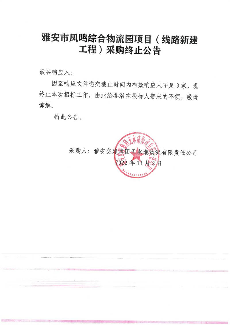 雅安交建集團無水港物流有限責任公司雅安市鳳鳴綜合物流園項目(線路新建工程)采購終止公告