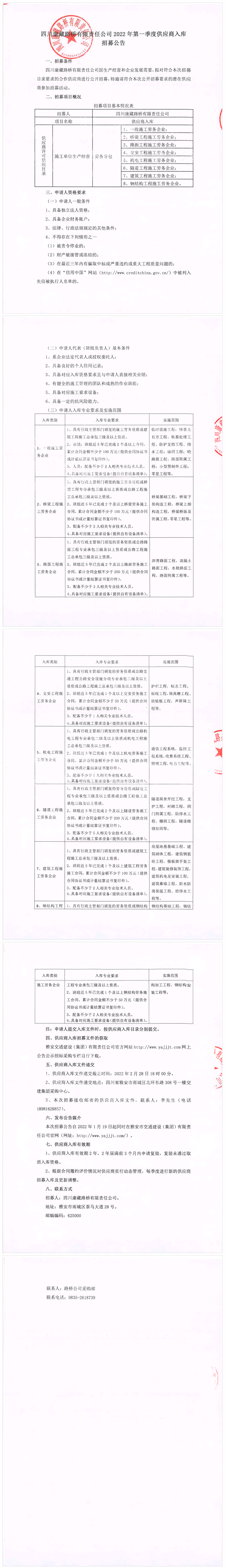 四川康藏路橋有限責(zé)任公司2022年第一季度供應(yīng)商入庫招募公告