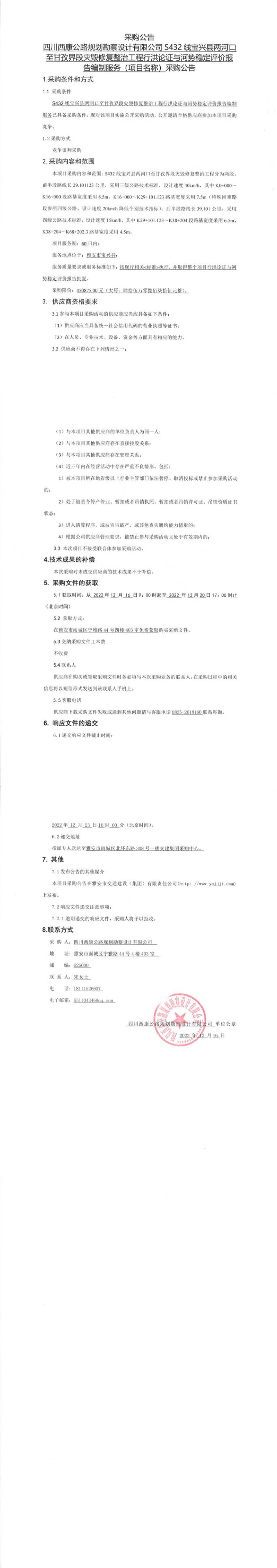 四川西康公路規(guī)劃勘察設(shè)計(jì)有限公司S432線寶興縣兩河口至甘孜界段災(zāi)毀修復(fù)整治工程行洪論證與河勢(shì)穩(wěn)定評(píng)價(jià)報(bào)告編制服務(wù)(項(xiàng)目名稱)采購(gòu)公告