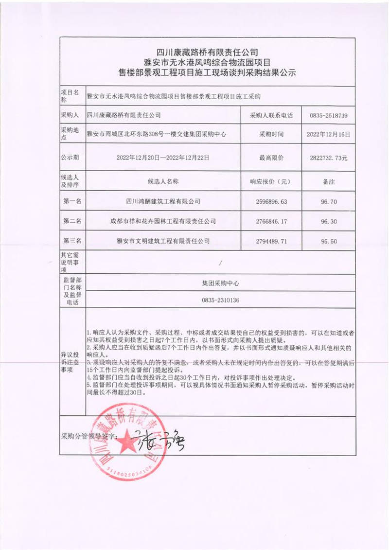 四川康藏路橋有限責(zé)任公司雅安市無水港鳳鳴綜合物流園項(xiàng)目售樓部景觀工程施工現(xiàn)場談判采購結(jié)果公示