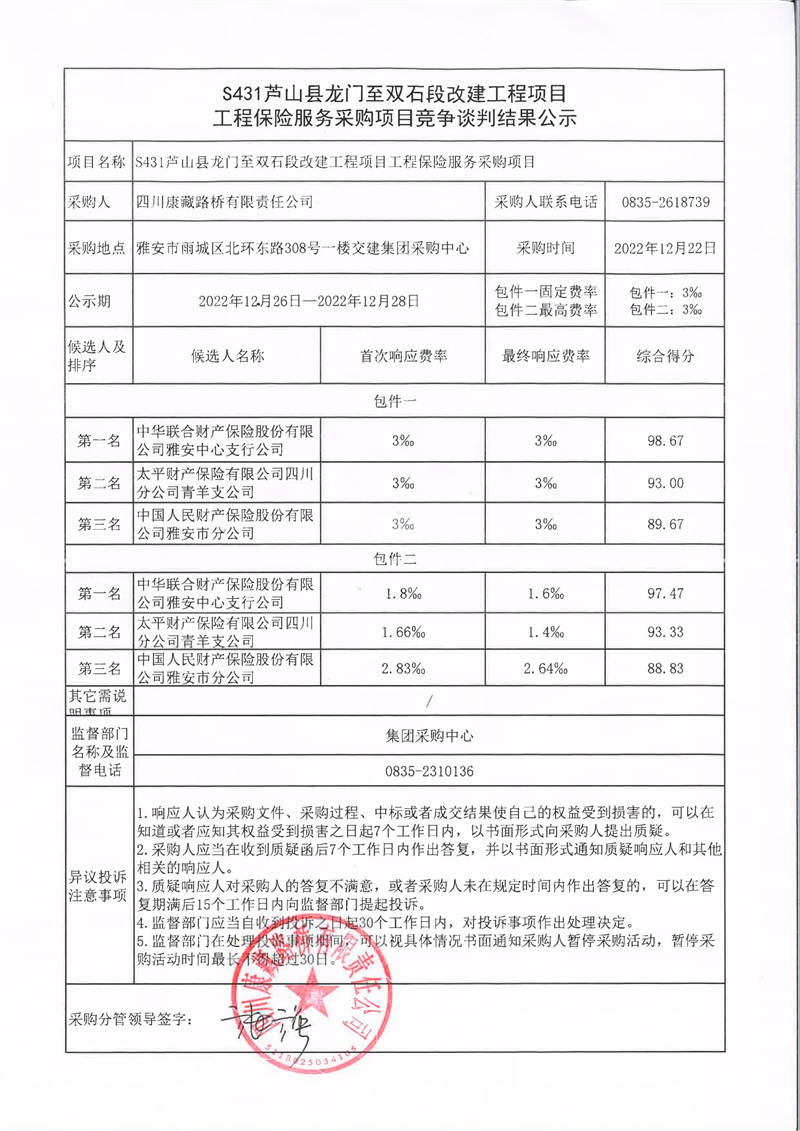 四川康藏路橋有限責(zé)任公司S431蘆山縣龍門至雙石段改建工程項(xiàng)目工程保險服務(wù)采購項(xiàng)目競爭談判結(jié)果公示