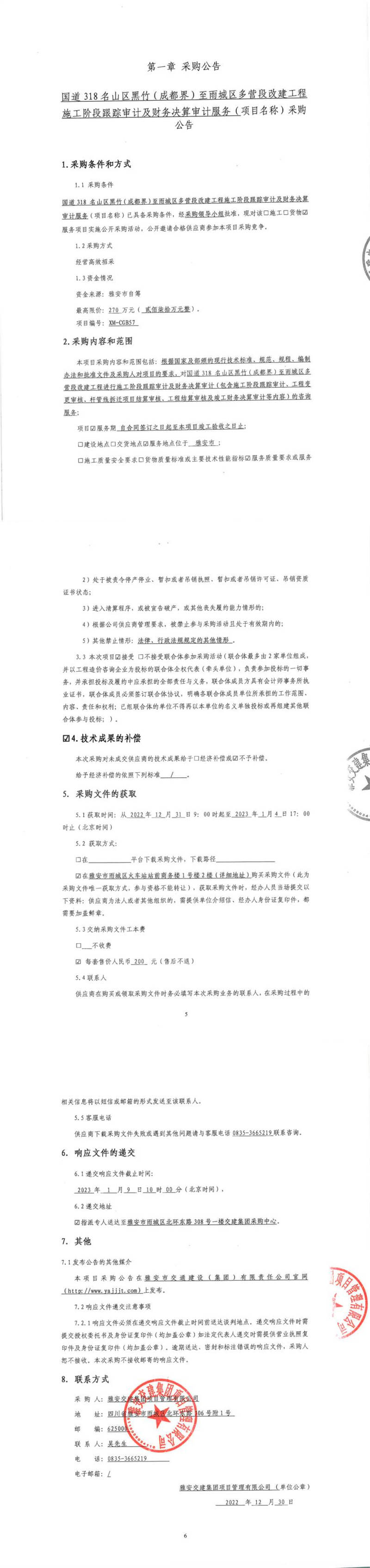 雅安交建集團(tuán)項(xiàng)目管理有限公司國道318名山區(qū)黑竹(成都界)至雨城區(qū)多營段改建工程施工階段跟蹤審計及財務(wù)決算審計服務(wù)采購公告