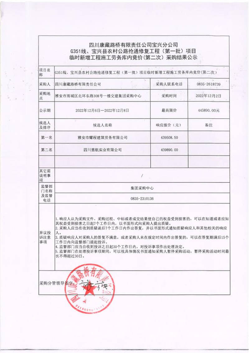 四川康藏路橋有限責任公司寶興分公司G351線、寶興縣農(nóng)村公路搶通修復(fù)工程(第一批)項目臨時新增工程施工勞務(wù)庫內(nèi)競價(第二次)采購結(jié)果公示