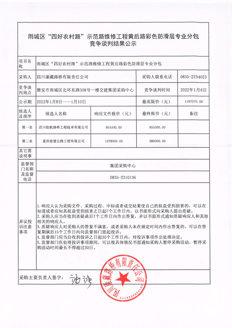 四川康藏路橋有限責(zé)任公司雨城區(qū)“四好農(nóng)村路”示范路維修工程黃后路彩色防滑層專業(yè)分包競(jìng)爭(zhēng)談判結(jié)果公示