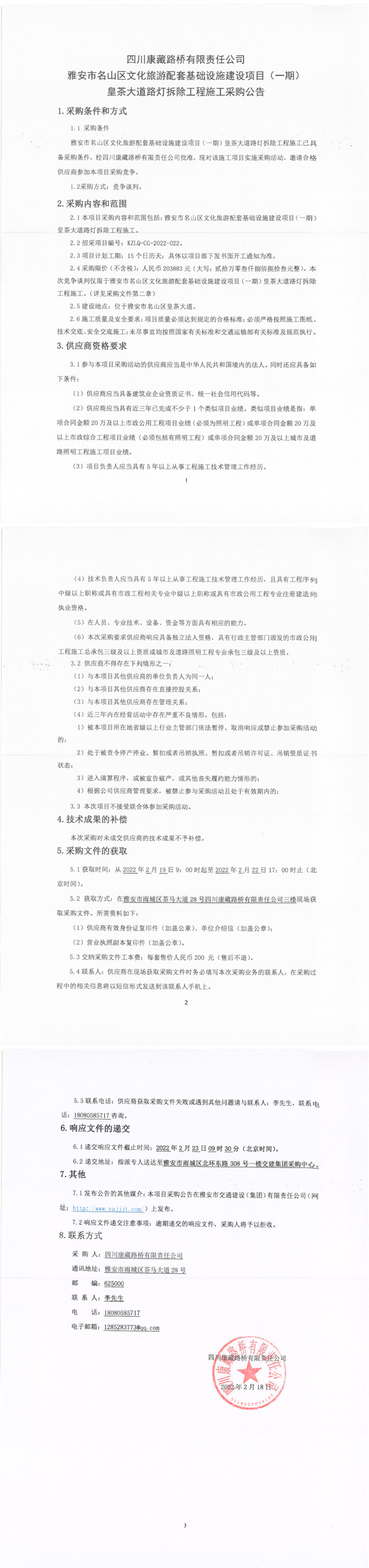 四川康藏路橋有限責任公司雅安市名山區(qū)文化旅游配套基礎設施建設項目(一期)皇茶大道路燈拆除工程施工采購公告