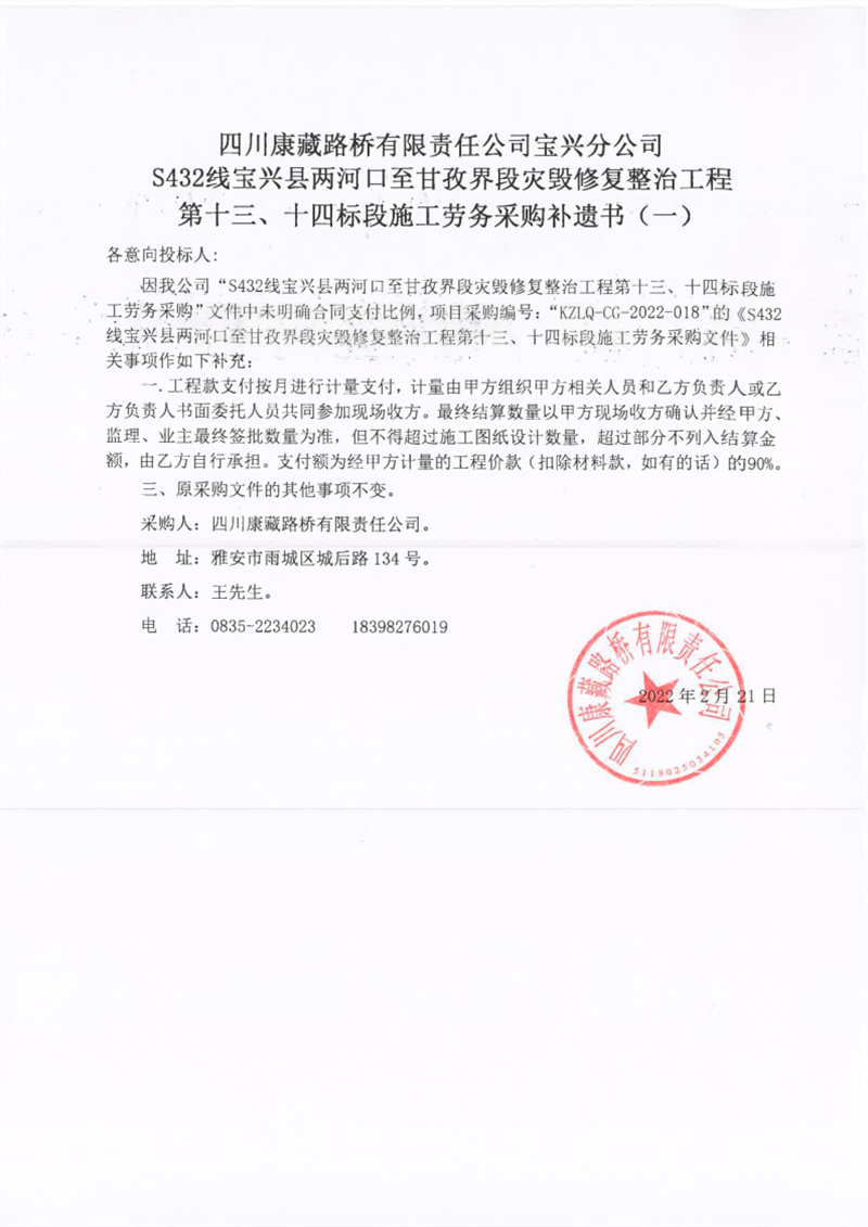 四川康藏路橋有限責(zé)任公司寶興分公司S432線寶興縣兩河口至甘孜界段災(zāi)毀修復(fù)整治工程第十三、十四標(biāo)段施工勞務(wù)采購(gòu)補(bǔ)遺書(shū)(一)
